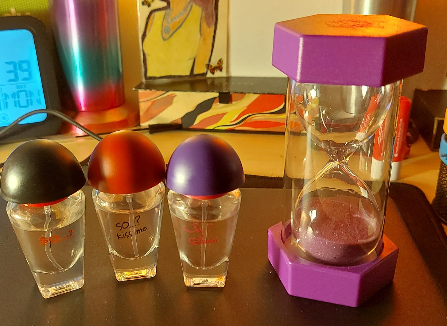 So..? Original. So..? Kiss Me. So..? Sinful miniature perfumes (from ‘back in the day’). My mum bought this gift set for me as “an item to put on your desk!” she knows how much I love perfume. I didn’t realise that I was probably dabbling in my own form of aromatherapy until people started to notice my frequent spraying of perfume, even when I wasn’t going anywhere and how often I would reapply it. I also have a tendency or quirk of spraying it directly in my own face with my eyes closed and on my hands. Soon, it became apparent to me and everyone else that I was using the fragrance to lift my mood as opposed to just smelling nice. I try not to overuse it in case I find myself having to go out to the shop or something. I had a ‘incident’ once when I went to the local shop and my friend behind the counter ended up having a sneezing and coughing fit because my stink had irritated their nose! Mortified. ;-) The other item is obviously an hourglass egg timer contraption. I use this to time myself when writing my ‘morning pages’ which to me are my ‘midnight pages’ with pen and ink in my journal type notebooks. I know there are timers everywhere. I have a huge digital clock now on my desk (that was another gift from mum) and I used to use timer videos from YouTube too, but I don’t want any distractions from devices, not even a clock, during my writing time. I even pick the egg timer up take it into the bedroom with my pen and paper and leave everything else behind. So, it’s just me, my mind, my words and time.